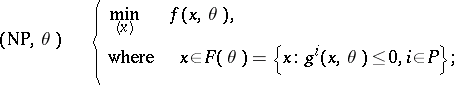 The necessary conditions for local optimality of parameters, subject to stable perturbations, are simplified under "input constraint qualifications" [[#References|[a21]]]. Global optimality of a parameter <img align="absmiddle" border="0" src="https://www.encyclopediaofmath.org/legacyimages/f/f130/f130250/f13025094.png" /> for the convex model can be characterized by a saddle-point condition on the region of cooperation of <img align="absmiddle" border="0" src="https://www.encyclopediaofmath.org/legacyimages/f/f130/f130250/f13025095.png" />. This is the set of all <img align="absmiddle" border="0" src="https://www.encyclopediaofmath.org/legacyimages/f/f130/f130250/f13025096.png" /> for which <img align="absmiddle" border="0" src="https://www.encyclopediaofmath.org/legacyimages/f/f130/f130250/f13025097.png" />. No stability is required in this case [[#References|[a22]]]. Programs that assume the form of a convex model, after "freezing" some variables, are called partly convex. Every program with twice continuously differentiable functions can be transformed into an equivalent partly convex program (cf., e.g., [[#References|[a8]]], [[#References|[a12]]]). | The necessary conditions for local optimality of parameters, subject to stable perturbations, are simplified under "input constraint qualifications" [[#References|[a21]]]. Global optimality of a parameter <img align="absmiddle" border="0" src="https://www.encyclopediaofmath.org/legacyimages/f/f130/f130250/f13025094.png" /> for the convex model can be characterized by a saddle-point condition on the region of cooperation of <img align="absmiddle" border="0" src="https://www.encyclopediaofmath.org/legacyimages/f/f130/f130250/f13025095.png" />. This is the set of all <img align="absmiddle" border="0" src="https://www.encyclopediaofmath.org/legacyimages/f/f130/f130250/f13025096.png" /> for which <img align="absmiddle" border="0" src="https://www.encyclopediaofmath.org/legacyimages/f/f130/f130250/f13025097.png" />. No stability is required in this case [[#References|[a22]]]. Programs that assume the form of a convex model, after "freezing" some variables, are called partly convex. Every program with twice continuously differentiable functions can be transformed into an equivalent partly convex program (cf., e.g., [[#References|[a8]]], [[#References|[a12]]]). | ||