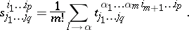 | − | + | Here the summation is taken over all <img align="absmiddle" border="0" src="https://www.encyclopediaofmath.org/legacyimages/s/s091/s091750/s0917508.png" /> permutations <img align="absmiddle" border="0" src="https://www.encyclopediaofmath.org/legacyimages/s/s091/s091750/s0917509.png" /> of <img align="absmiddle" border="0" src="https://www.encyclopediaofmath.org/legacyimages/s/s091/s091750/s09175010.png" />. Symmetrization relative to a group of lower indices is defined similarly. Symmetrization with respect to a group of indices is defined by placing these indices between round brackets <img align="absmiddle" border="0" src="https://www.encyclopediaofmath.org/legacyimages/s/s091/s091750/s09175011.png" />. The fixed indices (those not used in the symmetrization) are distinguished by vertical lines. For example (symmetrization over <img align="absmiddle" border="0" src="https://www.encyclopediaofmath.org/legacyimages/s/s091/s091750/s09175012.png" />; <img align="absmiddle" border="0" src="https://www.encyclopediaofmath.org/legacyimages/s/s091/s091750/s09175013.png" /> remains fixed), | |