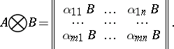 | − | The tensor product, or Kronecker product, of two matrices <img align="absmiddle" border="0" src="https://www.encyclopediaofmath.org/legacyimages/t/t092/t092410/t092410118.png" /> and <img align="absmiddle" border="0" src="https://www.encyclopediaofmath.org/legacyimages/t/t092/t092410/t092410119.png" /> is the matrix | + | The tensor product, or [[Kronecker product]] (cf. [[Matrix multiplication]]), of two matrices <img align="absmiddle" border="0" src="https://www.encyclopediaofmath.org/legacyimages/t/t092/t092410/t092410118.png" /> and <img align="absmiddle" border="0" src="https://www.encyclopediaofmath.org/legacyimages/t/t092/t092410/t092410119.png" /> is the matrix |