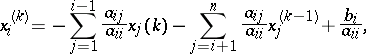 | − | where the | + | where the <img align="absmiddle" border="0" src="https://www.encyclopediaofmath.org/legacyimages/s/s083/s083810/s0838106.png" /> are the entries of the matrix <img align="absmiddle" border="0" src="https://www.encyclopediaofmath.org/legacyimages/s/s083/s083810/s0838107.png" />, <img align="absmiddle" border="0" src="https://www.encyclopediaofmath.org/legacyimages/s/s083/s083810/s0838108.png" /> the components of the vector <img align="absmiddle" border="0" src="https://www.encyclopediaofmath.org/legacyimages/s/s083/s083810/s0838109.png" />, and the diagonal entries of <img align="absmiddle" border="0" src="https://www.encyclopediaofmath.org/legacyimages/s/s083/s083810/s08381010.png" /> are assumed to be <img align="absmiddle" border="0" src="https://www.encyclopediaofmath.org/legacyimages/s/s083/s083810/s08381011.png" />. The use of (*) differs from the [[Simple-iteration method|simple-iteration method]] only in the fact that, at step <img align="absmiddle" border="0" src="https://www.encyclopediaofmath.org/legacyimages/s/s083/s083810/s08381012.png" />, computation of the <img align="absmiddle" border="0" src="https://www.encyclopediaofmath.org/legacyimages/s/s083/s083810/s08381013.png" />-th component utilizes the previously computed <img align="absmiddle" border="0" src="https://www.encyclopediaofmath.org/legacyimages/s/s083/s083810/s08381014.png" />-th approximations of the first <img align="absmiddle" border="0" src="https://www.encyclopediaofmath.org/legacyimages/s/s083/s083810/s08381015.png" /> components. |