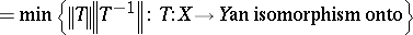 | [a25] | V.E. Gurarii, M.I. Kadec, V.E. Macaev, "On the distance between isomorphic spaces of finite dimension" Math. Sb. , 70 (1966) pp. 481–489 (In Russian) |