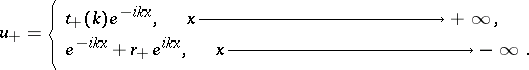 \begin{equation} \tag{a4} u_{+} = \left\{ \begin{array} { ll } t_{+}(k) e^{-ikx}, & x \xrightarrow{\qquad\qquad\qquad\qquad\qquad\qquad } +\infty, \\ e^{-ikx} + r_{+}e^{ikx}, & x \xrightarrow{\qquad\qquad\qquad\qquad\qquad\qquad } -\infty. \end{array} \right. \end{equation}