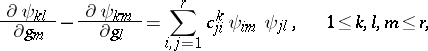 \begin{equation} \sum _ { k = 1 } ^ { N } ( \xi _ { i k } \frac { \partial \xi _ { j l } } { \partial x _ { k } } - \xi _ { j k } \frac { \partial \xi _ { i l } } { \partial x _ { k } } ) = \sum _ { k = 1 } ^ { r } c _ { i j } ^ { k } \xi _ { k l } \end{equation}