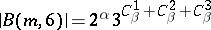 227. b13030047.png ; $| B ( m , 6 ) | = 2 ^ { \alpha } 3 ^ { C _ { \beta } ^ { 1 } + C _ { \beta } ^ { 2 } + C _ { \beta } ^ { 3 } }$ ; confidence 0.861
