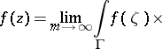 204. c12004027.png ; $f ( z ) = \operatorname { lim } _ { m \rightarrow \infty } \frac { 1 } { 2 \pi i } \int _ { \Gamma } f ( \zeta ) \left( \frac { z } { \zeta } \right) ^ { m } \frac { d \zeta } { \zeta - z }.$ ; confidence 0.862