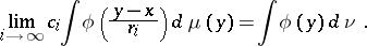 241. g13004096.png ; $\operatorname { lim } _ { i \rightarrow \infty } c _ { i } \int \phi \left( \frac { y - x } { r _ { i } } \right) d \mu ( y ) = \int \phi ( y ) d \nu.$ ; confidence 0.860