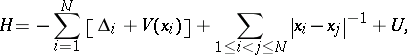 215. t12006083.png ; $H = - \sum _ { i = 1 } ^ { N } [ \Delta _ { i } + V ( x _ { i } ) ] + \sum _ { 1 \leq i < j \leq N } | x _ { i } - x _ { j } | ^ { - 1 } + U,$ ; confidence 0.862