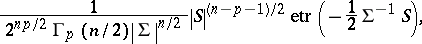 ; $\frac { 1 } { 2 ^ { n p / 2 } \Gamma _ { p } ( n / 2 ) | \Sigma | ^ { n / 2 } } | S | ^ { ( n - p - 1 ) / 2 } \operatorname { etr } \left( - \frac { 1 } { 2 } \Sigma ^ { - 1 } S \right),$ ; confidence 0.542