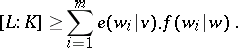 ; $[ L : K ] \geq \sum _ { i = 1 } ^ { m } e ( w _ { i } | v ) . f ( w _ { i } | w ).$ ; confidence 0.157