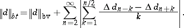 ; $\| d \| _ { b t } = \| d \| _ { \operatorname {bv} } + \sum _ { n = 2 } ^ { \infty } \left| \sum _ { k = 1 } ^ { n / 2 } \frac { \Delta d _ { n - k } - \Delta d _ { n + k } } { k }\right|.$ ; confidence 0.182