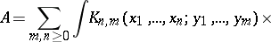 ; $A = \sum _ { m , n \geq 0 } \int K _ { n , m } ( x _ { 1 } , \ldots , x _ { n } ; y _ { 1 } , \ldots , y _ { m } ) \times$ ; confidence 0.178