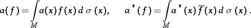 ; $a ( f ) = \int _ { M } a ( x ) f ( x ) d \sigma ( x ) , \quad a ^ { * } ( f ) = \int _ { M } a ^ { * } ( x ) \overline { f } ( x ) d \sigma ( x ).$ ; confidence 0.180