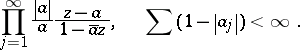 282. b1202805.png ; $\prod _ { j = 1 } ^ { \infty } \frac { | a | } { a } \frac { z - a } { 1 - \overline { a } z } , \quad \sum ( 1 - | a _ { j } | ) < \infty .$ ; confidence 0.091