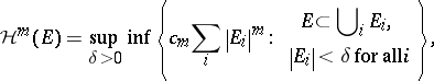 243. g13004016.png ; $\mathcal{H} ^ { m } ( E ) = \operatorname { sup } _ { \delta > 0 } \operatorname { inf } \left\{ c _ { m } \sum _ { i } | E _ { i } | ^ { m } : \quad \begin{array} { c } { E \subset \cup _ { i } E _ { i } } \\ { | E _ { i } | < \delta \text { for all } } \ i \end{array} \right\},$ ; confidence 0.095