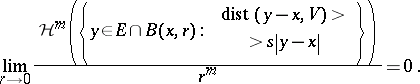266. g13004048.png ; $\operatorname { lim } _ { r \rightarrow 0 } \frac { \mathcal{H} ^ { m } \left( \left\{ y \in E \cap B ( x , r ) : \begin{array} { l } { \text { dist } ( y - x , V ) >} \\ {> s | y - x | }\end{array} \right\} \right) } { r^m } ) = 0.$ ; confidence 0.092