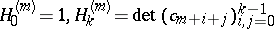 53. s13059025.png ; $H _ { 0 } ^ { ( m ) } = 1 ,\, H _ { k } ^ { ( m ) } = \operatorname { det } ( c_{ m + i + j} ) _ { i ,\, j = 0 } ^ { k - 1 }$ ; confidence 0.117