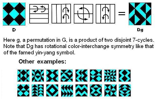 Using this theory, we can summarize the patterns' properties by saying that G is isomorphic to the affine group A on the linear 4-space over GF(2) and that the 35 structures of the 840 = 35 x 24 G-images of D are isomorphic to the 35 lines in the 3-dimensional projective space over GF(2).
