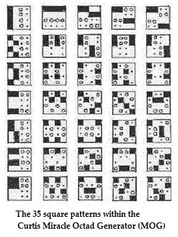 As originally presented, the Curtis MOG was a correspondence between the 35 partitions of an 8-set into two 4-sets and the 35 patterns illustrated above. That correspondence was preserved by the actions of the Mathieu group M24 on a rectangular array.